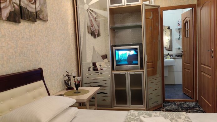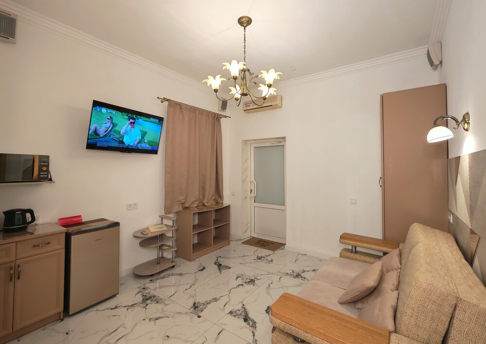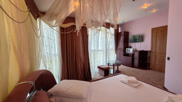 Здание гостиницы построено из экологически чистых материалов с использованием современных строительных технологий, что позволило обеспечить гостям красивый, качественный и комфортный отдых. Территория, внутренний двор гостиницы - ещё одно из её ярких достоинств. Оригинальное решение натяжного потолка, ротанговая мебель, плазменных телевизоров, максимум зелени, фонтан–горка в зоне отдыха, изумительный восточный колорит всей отделки гостиницы – создают атмосферу незабываемого отдыха для всей семьи. Во дворе гостиницы никогда, даже в самую летнюю жару не бывает жарко! Постояльцы гостиницы с удовольствием отдыхают и общаются на свежем воздухе.