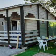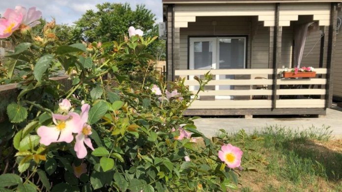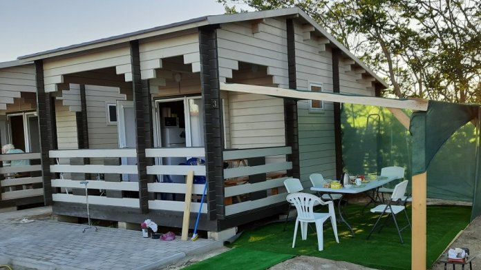 Новые комфортабельные домики 2020 года постройки из натурального дерева. Три спальных места (диван и кровать), туалет, душ, кондиционер, холодильник, просторная терраса, телевизор, на территории базы есть Wi-Fi. Есть летний душ и поддон для ополаскивания ног после моря. Садовые качели, игрушки для маленьких отдыхающих, а для подростков и взрослых современные настольные игры.