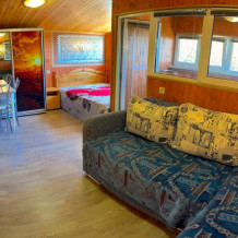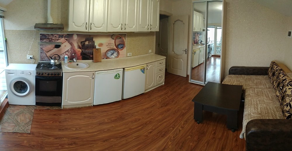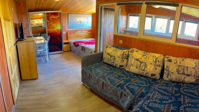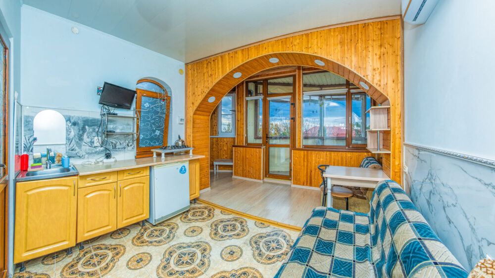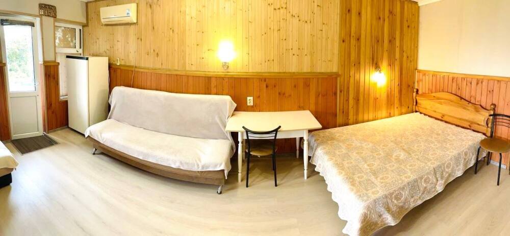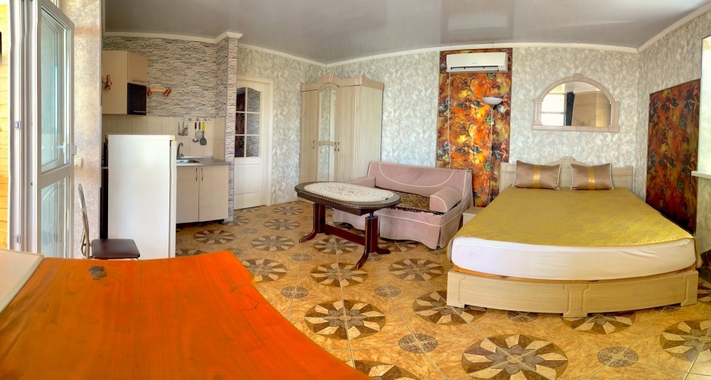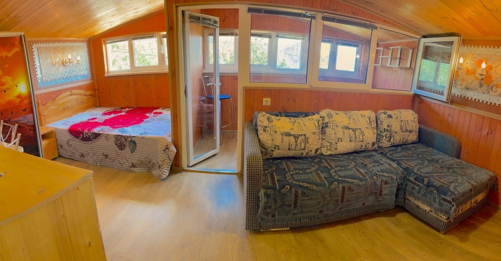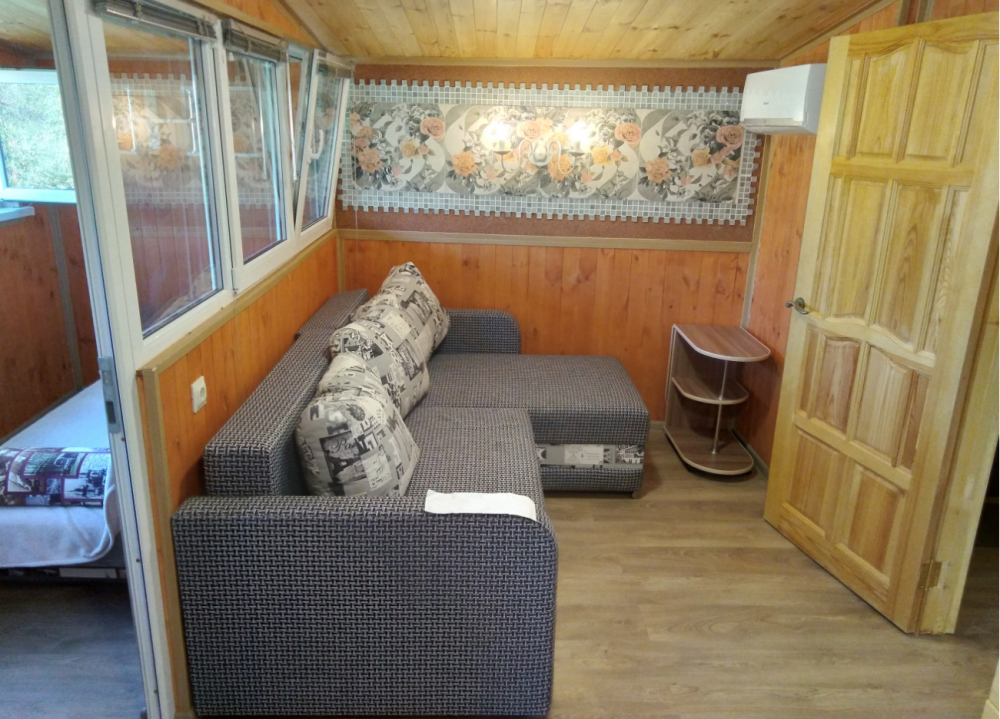 Терраса на 2 номера перед входом в номер. В номере: 2 двуспальных новых мягких дивана. На кухне: газовая плита и набор всей необходимой посуды.
