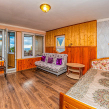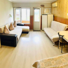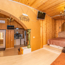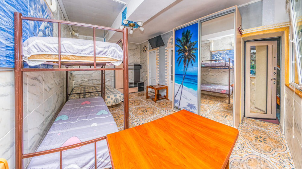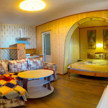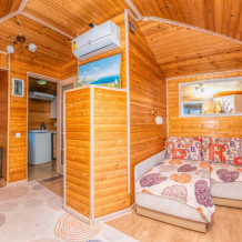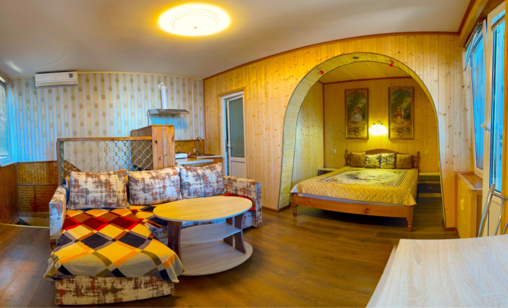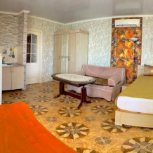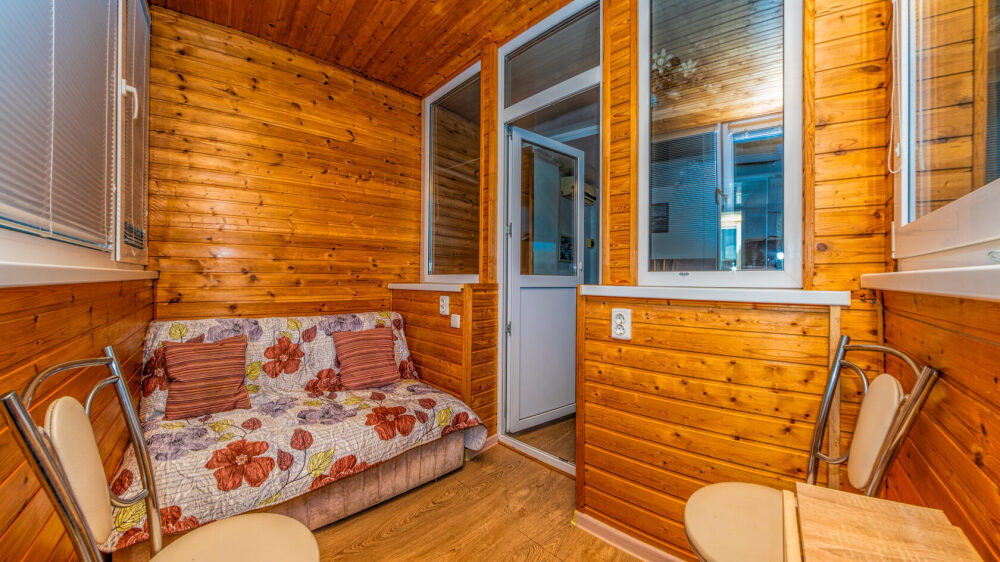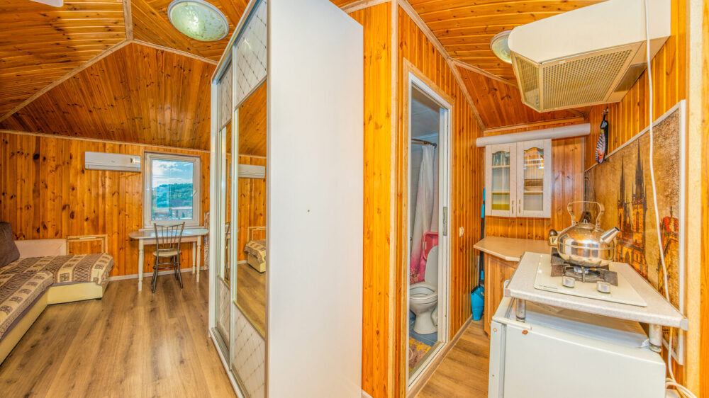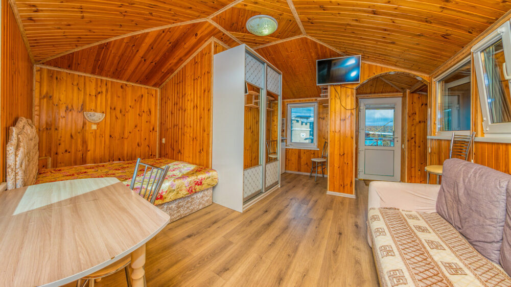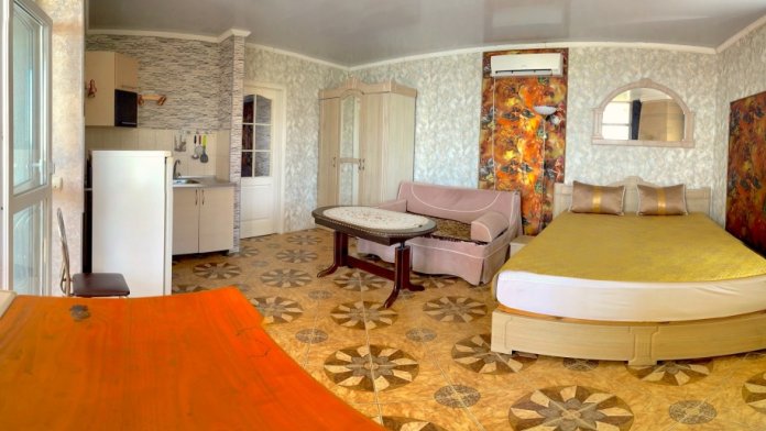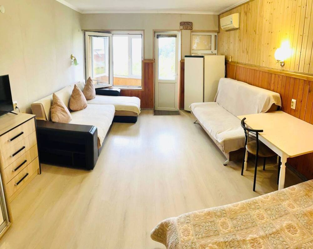Терраса на 2 номера перед входом в номер. В номере: 2 двуспальных новых мягких дивана. На кухне: газовая плита и набор всей необходимой посуды.