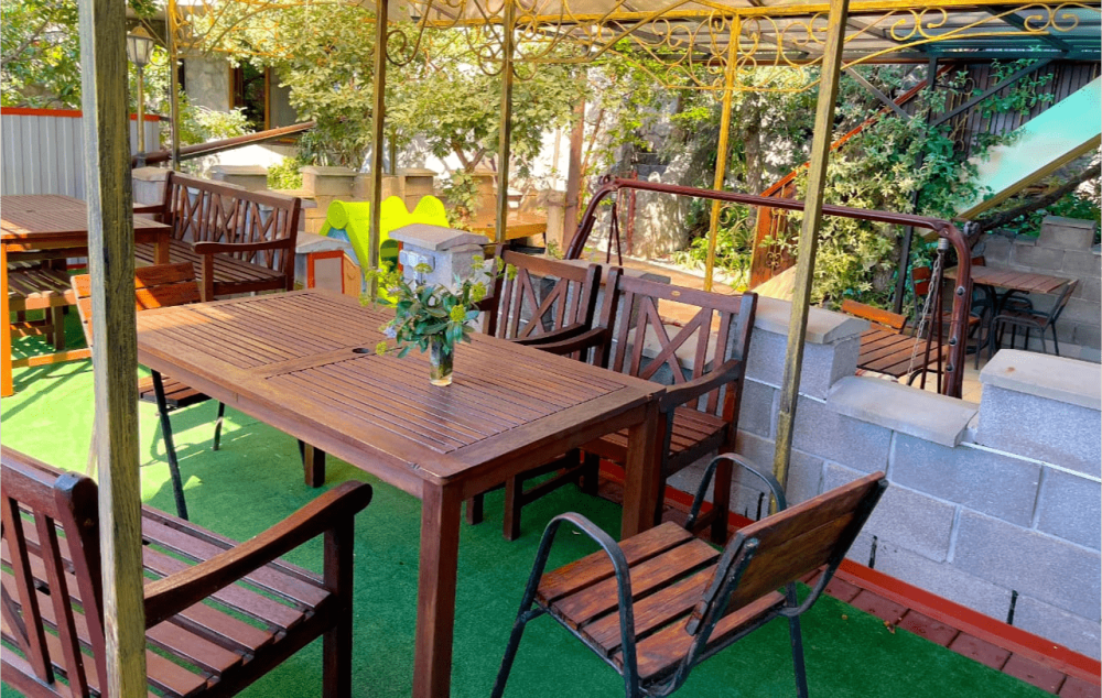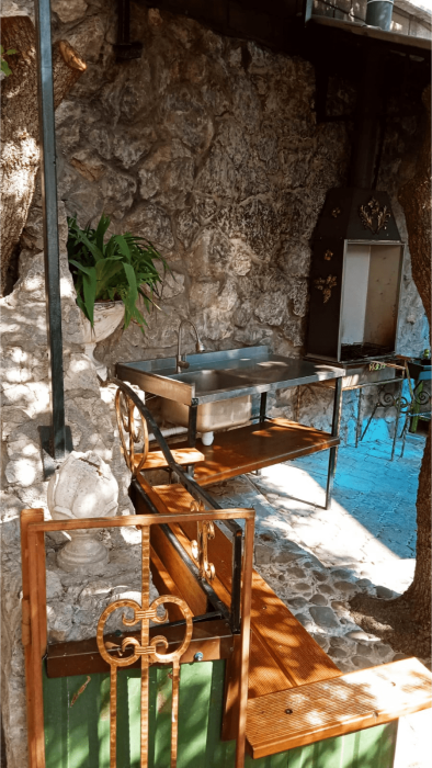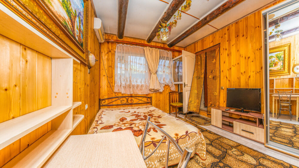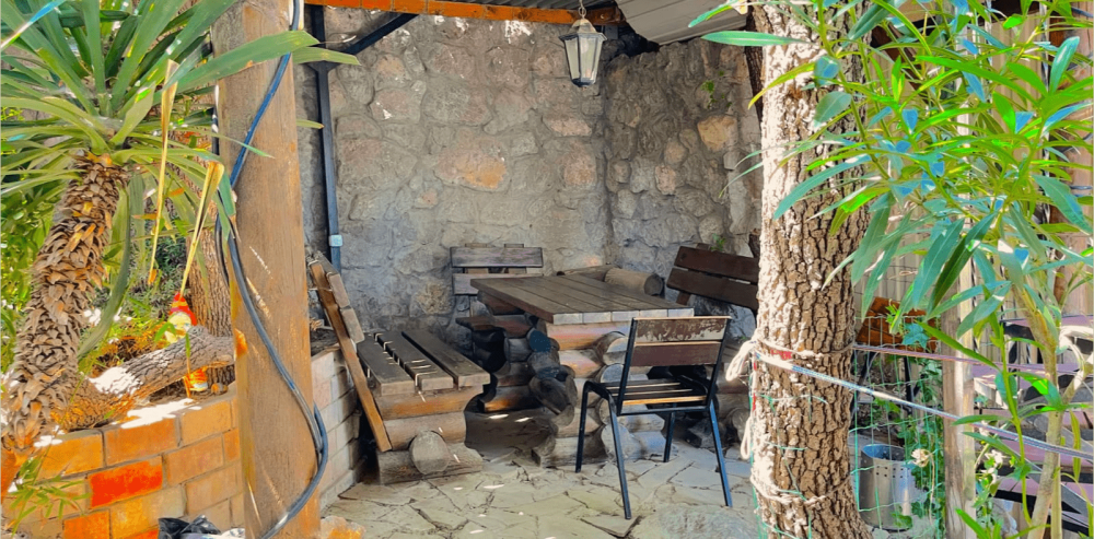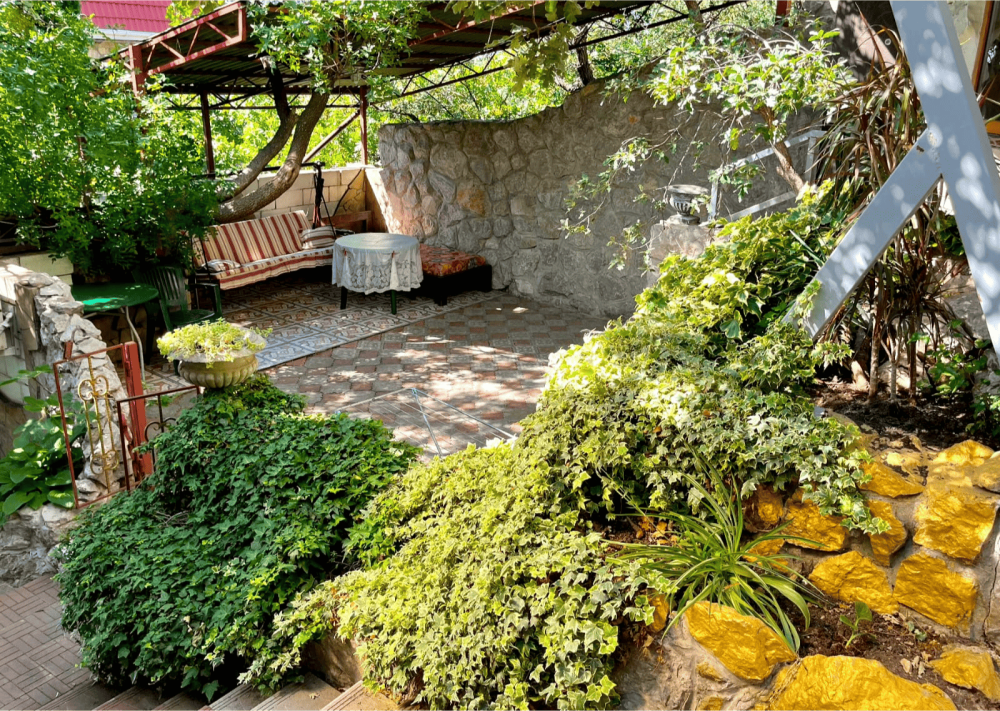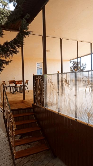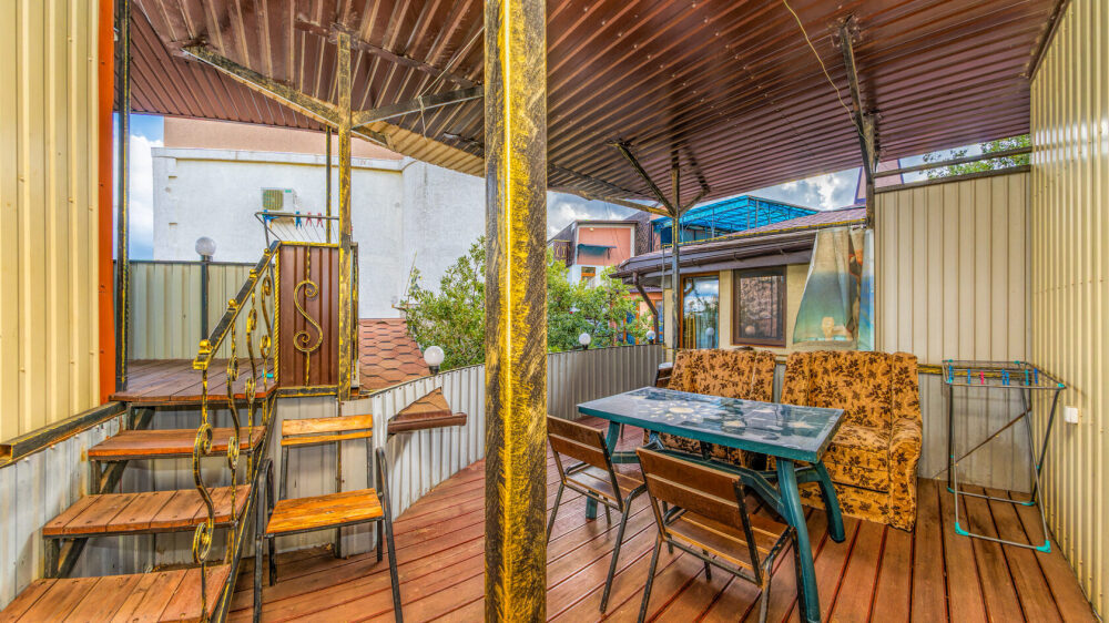 Номер имеет свой отдельный уютный огороженный дворик с навесом. Во дворике расположены 1-спальная кровать, стол и 3 стула. Удобен для отдыха с четвероногим другом.