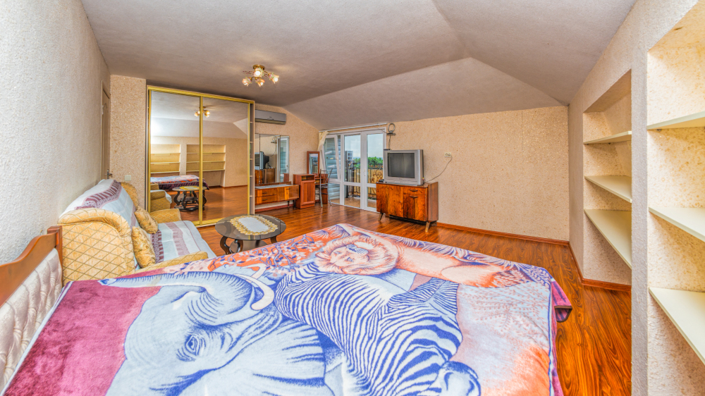 Номер с большой видовой (20 кв. м) террасой с шезлонгами и уличной мебелью.