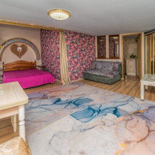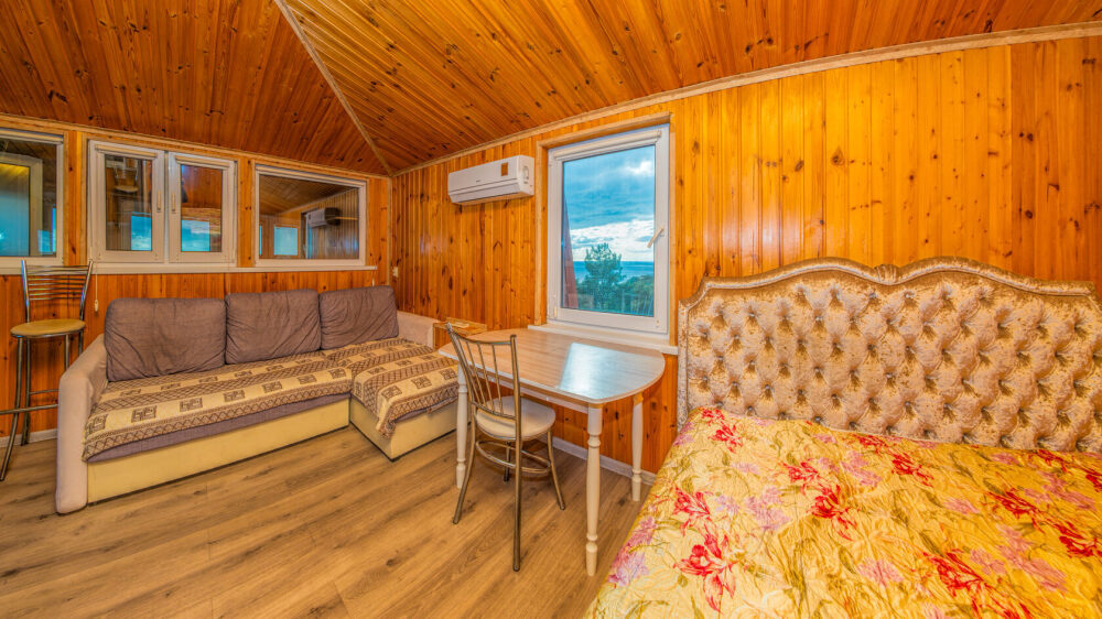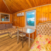 Номер с большой видовой персональной террасой (24 кв м). На террасе: большой стол, 2 кресла, 3 стула, комод, сушилка и 1-спальная кровать.