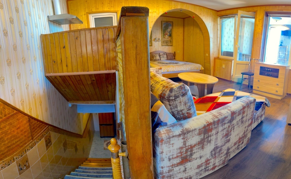 Номер с видовым крытым балконом, камином и винтовой лестницей.