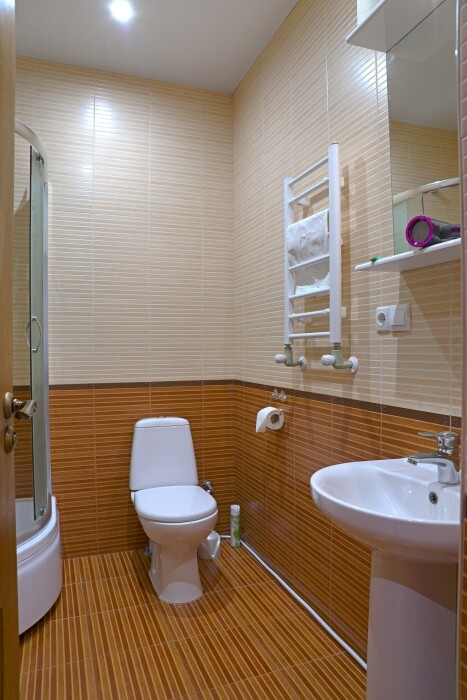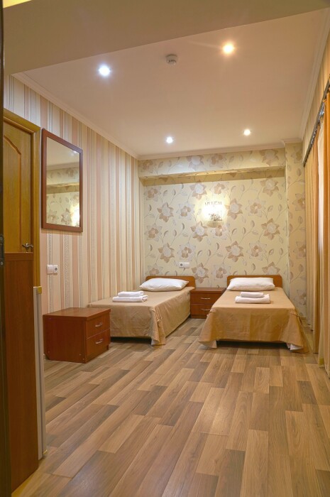 В номере есть холодильник, телевизор, wi-fi, фен, полотенца, стол, тумбочки, шкаф-гардероб. Санузел совмещенный с душевой кабинкой.