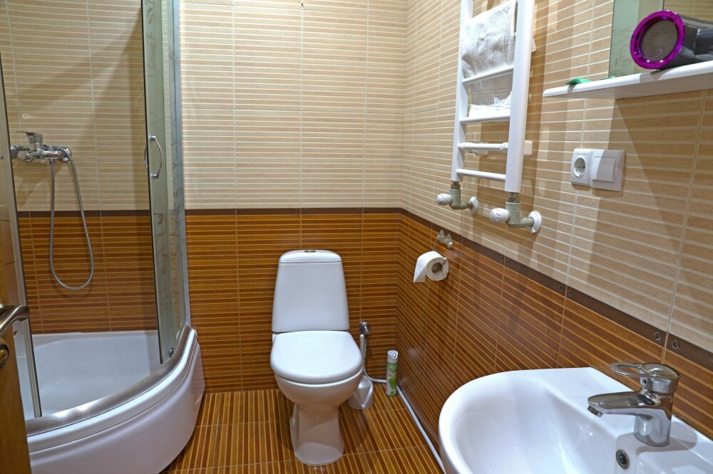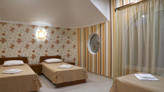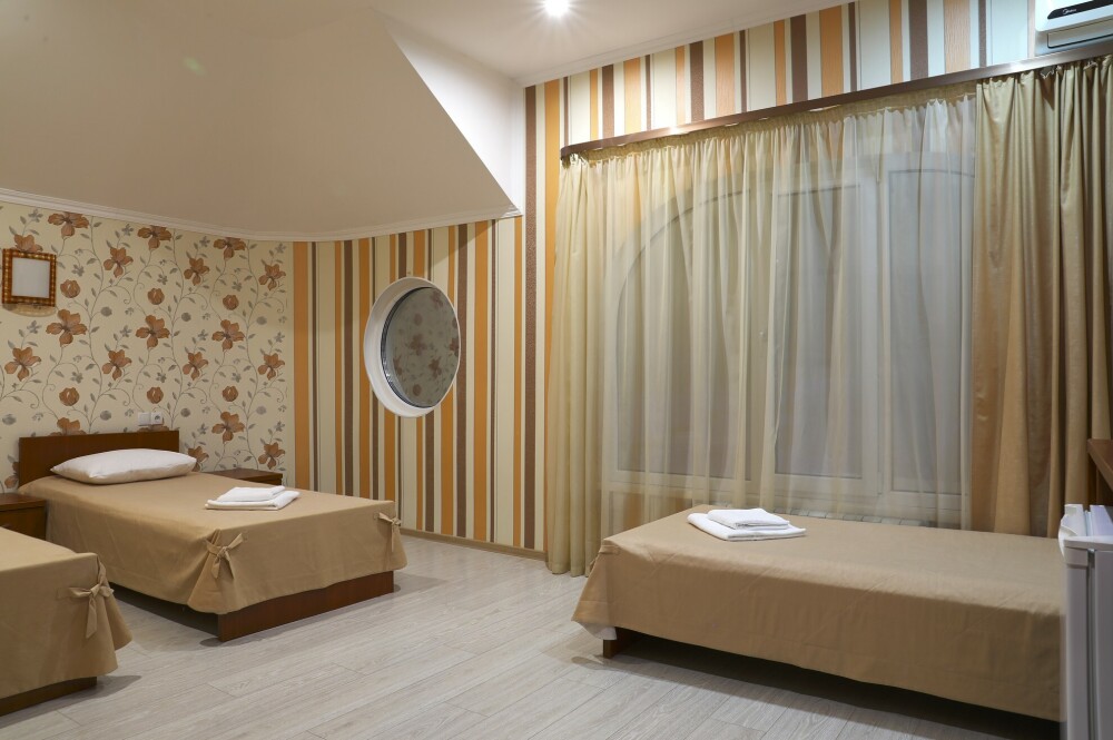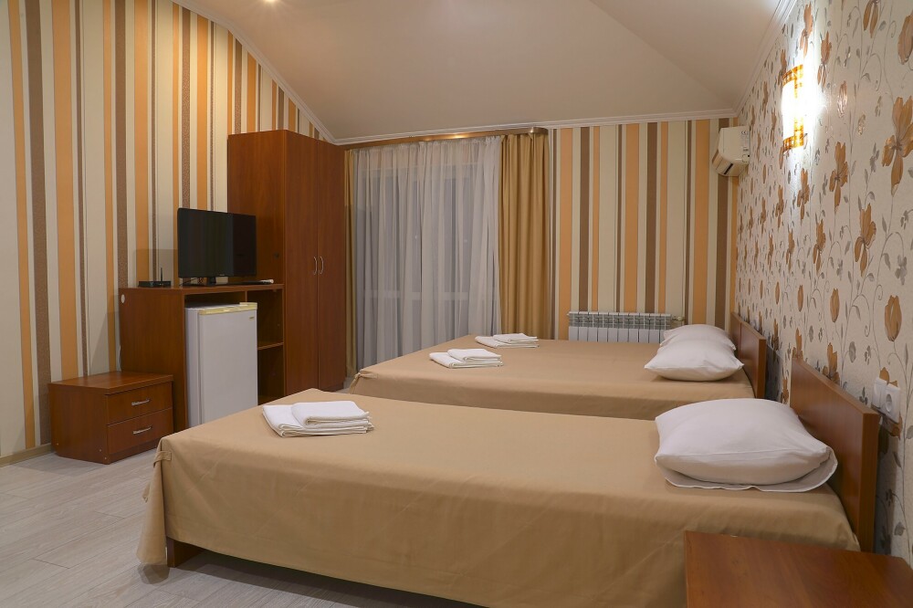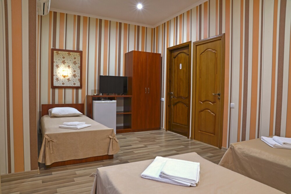 В номере есть кондиционер, холодильник, телевизор, wi-fi, фен, полотенца, стол, тумбочки, шкаф-гардероб. Санузел совмещенный с душевой кабинкой.