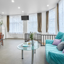 Во-вторых, большие панорамные окна, квартира очень светлая и уютная. С отдельным входом (практически отдельный дом в самом центре города).