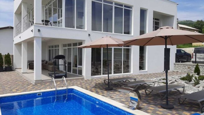 Сдаётся новая вилла с бассейном в гостевом комплексе «Горная лаванда» в Алуште. В бассейне: подогрев, противоток, гидромассаж, водопад, подсветка RGB. Бассейн с подогревом. Релакс зона: лежаки, столики, зонты у бассейна.