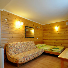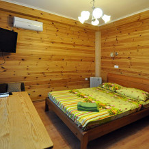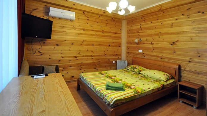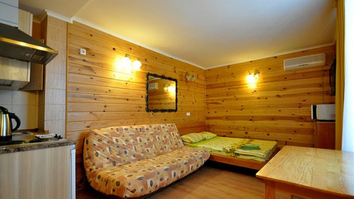Предлагаем проживание в номерах 2+2 - двуспальная кровать и двухместный диван, и 2+1 - двуспальная кровать и одноместный диван. В каждом номере: одна комната, отделанная деревом, санузел, телевизор, кондиционер, кухонный блок с набором посуды, варочной панелью и холодильником. На каждые два номера видовая терраса с обеденными столами.