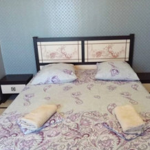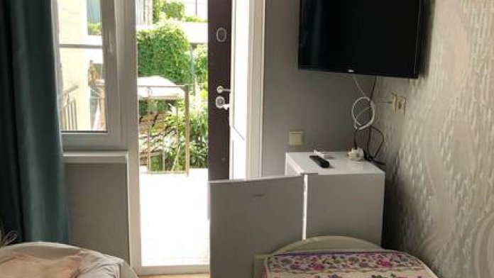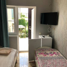 На территории терраса с видом на море и горы, зелёный двор, мангал, общая кухня (микроволновая печь, посуда, вся необходимая техника), стиральная машинка, утюг, гладильная доска, уборка номеров по требованию, смена белья раз в 5 дней.