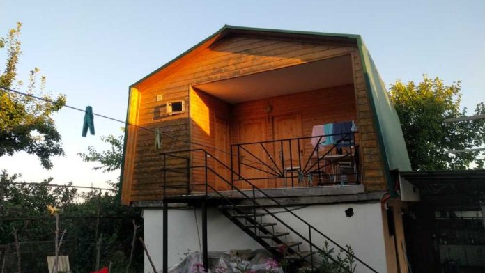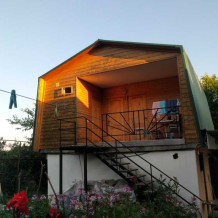 Во дворе общая кухня летняя, холодильник, столы, душ теплый, санузел. Отдельно в деревянной мансарде есть 2 номера на 2-3 человека. Общий балкон с видом на горы.