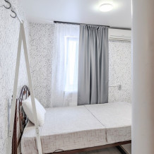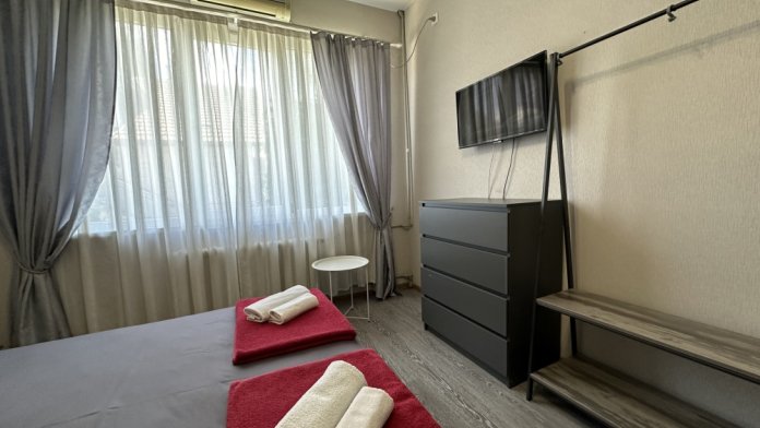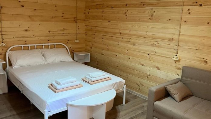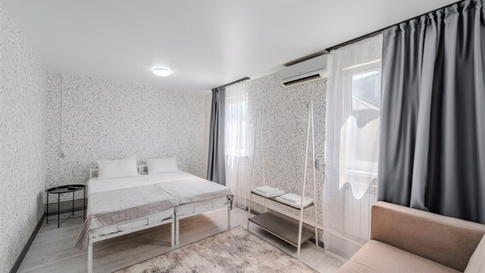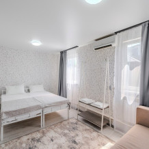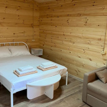 Просторный однокомнатный номер с двуспальной кроватью и двухместным раскладным диваном. С отдельным входом и террасой.