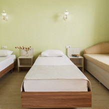 В номере: двуспальная и одна односпальная, либо три односпальные кровати, стол, стул, цифровое ТВ, холодильник, сплит-система, ванная комната с душем, балкон/терраса.