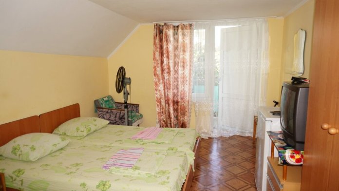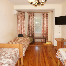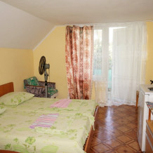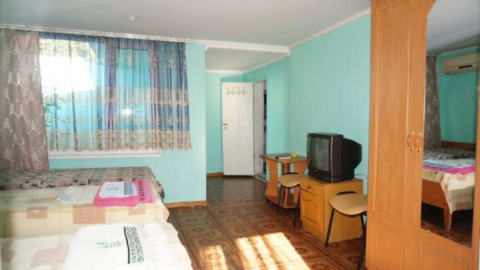 Семейный» номер находиться на 2 этаже, состоит из 2х комнат и застекленной лоджии, возможно размещение от 4 до 7 человек (цена за доп. место указана для 5го человека). В каждой комнате по 3 спальных места, ТВ, кондиционер, Wi-Fi и одно дополнительное место на лоджии (без ТВ и кондиционера). Постельное белье и полотенце предоставляются. Перед входом свой навес со столом.