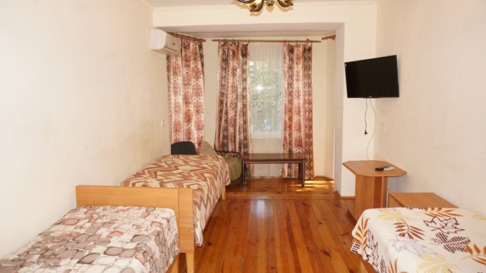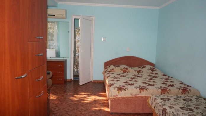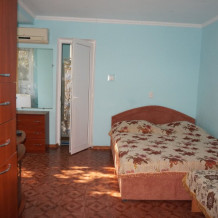 «Эконом» 2−3х местный включает: 3 односпальные или 1 двуспальную и 1 односпальную кровати, санузел и душ, ТВ, холодильник и вентилятор, Wi-Fi. Постельное белье и полотенца предоставляются. Общая кухня на территории со всем необходимым для приготовления пищи.