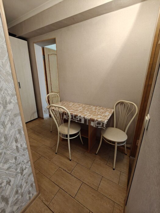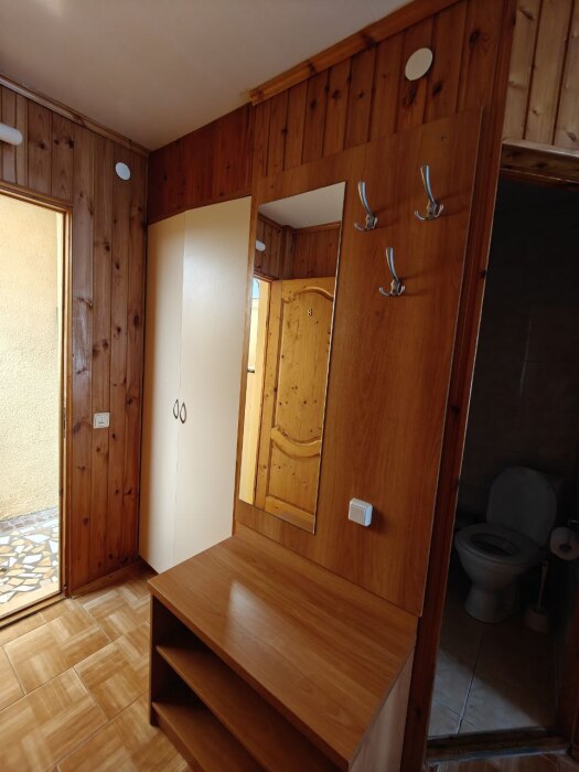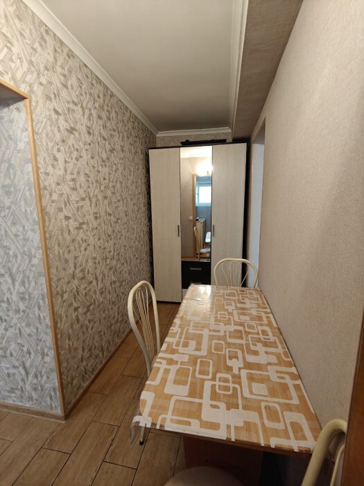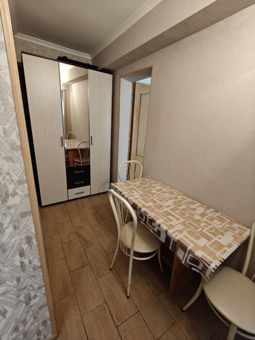 Имеется шкаф, вешалка, стол обеденный, туалетный столик, стулья.