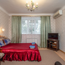 На первом этаже 5 этажного дома .В квартире имеется все необходимое для проживания : мебель, техника, кухонная утварь, кондиционер, фен, утюг. постельное белье, полотенца, смарт тв , вай фай, свое отопление. Окна квартиры выходят на свой полисадник. Квартира чистая, светлая. Находится на ровном удобном месте 2 линия не шумно.