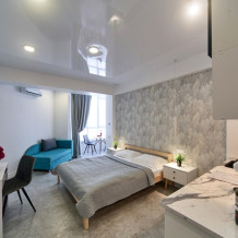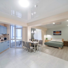 Каждая деталь в апартаментах продумана для Вашего комфорта: современная кухонная зона для приготовления любимых блюд, обеденная зона для уютных завтраков, телевизор для вечернего отдыха и бесплатный Wi-Fi для связи. В Вашем распоряжении холодильник, фен, мягкое постельное белье и банные принадлежности, а также мини-парфюмерия и тапочки для Вашего абсолютного удобства.
