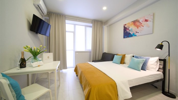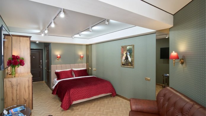Также в апартаментах предусмотрены телевизор, бесплатный Wi-Fi,индивидуальный климат-контроль, постельное белье, мини-парфюмерия и тапочки.