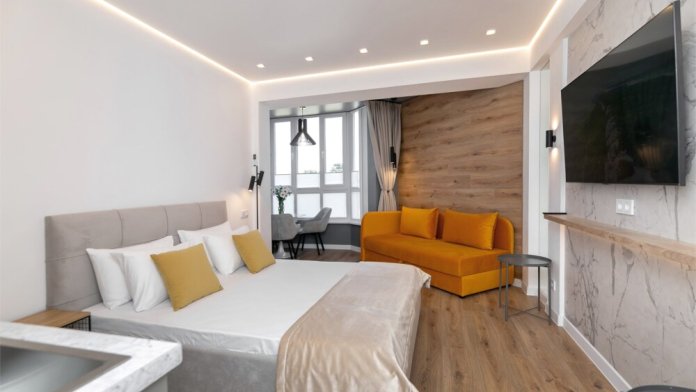 Вас ждёт уютная спальня с удобной двуспальной кроватью и раскладным диваном, что делает эти апартаменты идеальными для одного или двух взрослых, с возможностью организации дополнительного места.