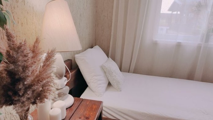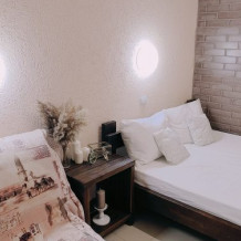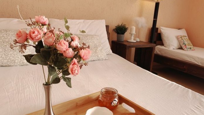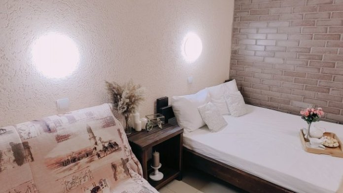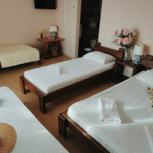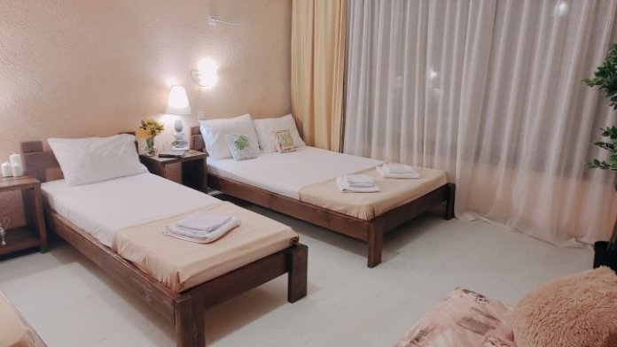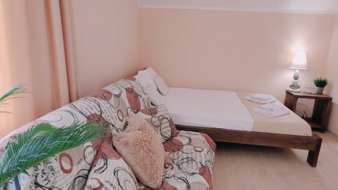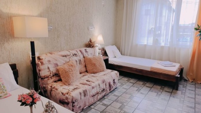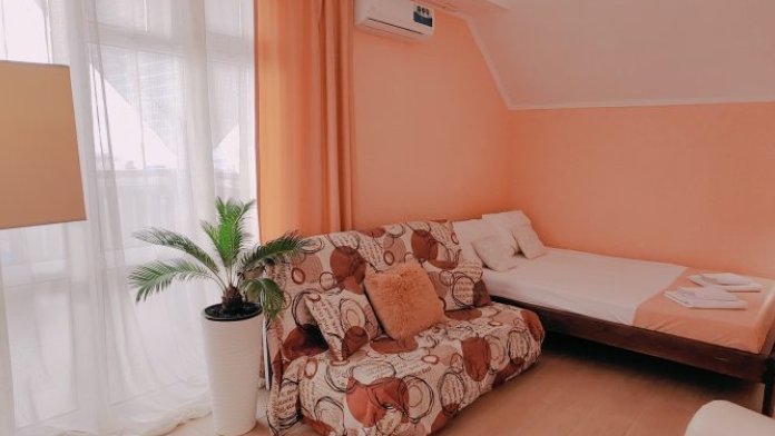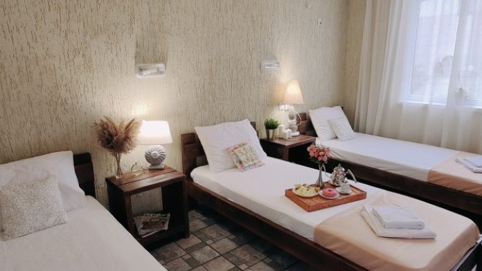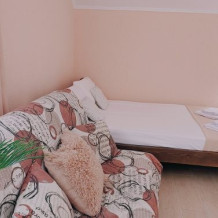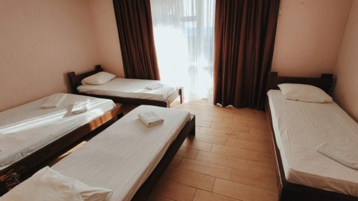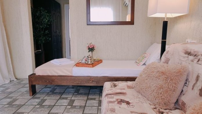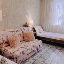 В номере: двуспальная кровать, диван-кровать и односпальная кровать или двуспальная кровать и три односпальные кровати. Также есть мультиварка или одноконфорочная плитка.