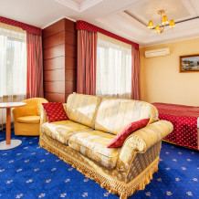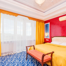 Две туалетные комнаты (ванная, душевая кабина, биде), теплый пол, мягкие махровые халаты, тапочки и фен. В номере есть электрочайник и бесшумный холодильник. Барная стойка, кондиционер, сейф и ЖК телевизор в каждой комнате, мягкая мебель, винный шкаф. Возможность дополнительного проживания еще двух человек.