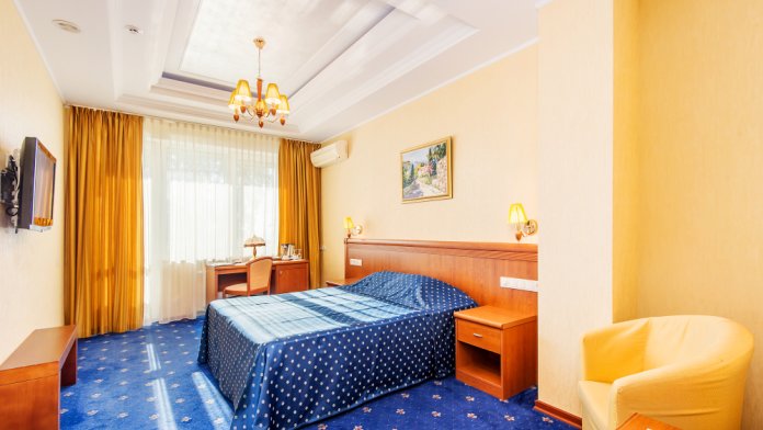 2-комнатный номер с королевской спальней, светлой гостиной, балконом с мебелью и панорамным видом на море и город. Из окон номера открывается вид на гору Демерджи, крепость Алустон, городской фонтан.