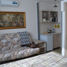 Из хорошего: есть небольшая стоянка для авто; пляж действительно в шаговой доступности. Прилегающая территория без зелени, сплошной асфальт, на солнце очень прогревается, вечером на территории негде насладиться прохладой, взгляд упирается в забор.Стиральная машина , мангал есть, но иногда нужно заниматься очередь. Уборка в номере своими силами. Бельё,как написано в памятке замена через 10-ть, не меняли. Неудачно расположение кондиционера, дует прямо на кровать, простыли: у мужа воспалился глаз, у меня герпес на губах. Неудобный матрас, начала болеть спина, маленькие подушки, голова бьётся об изголовье кровати. Пишу свои ощущения максимально честно, так как сама сделала выбор по отзывам отдыхающих. Нюансов ещё много, писать можно долго. Вывод: второй раз приехать сюда на отдых не рискну. Но как говорится, на вкус и цвет, кому-то это и понравится. Спасибо.