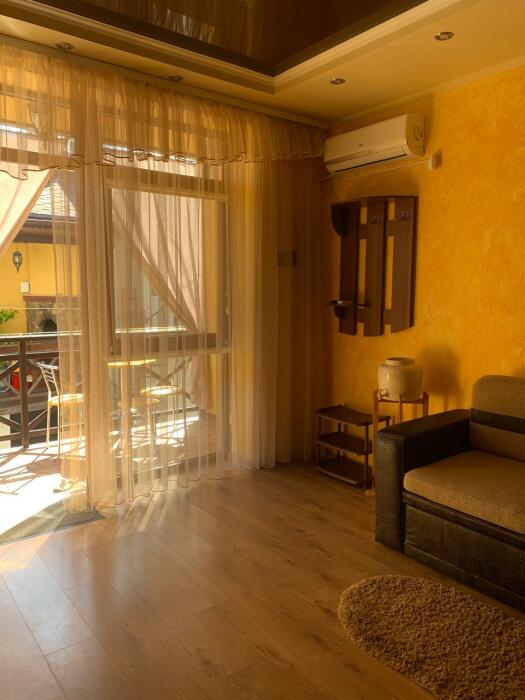 Номер 1/1 - индивидуальный номер со всем необходимым для проживания: комната - студия, кухня, полный набор посуды, холодильник, кондиционер, TV кабельное, Wi-fi, белье, сан узел с душевой (горячая/холодная вода постоянно), полотенца, просторные балконы с видом на тихую улочку без машин.