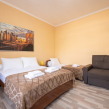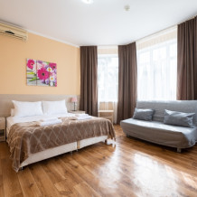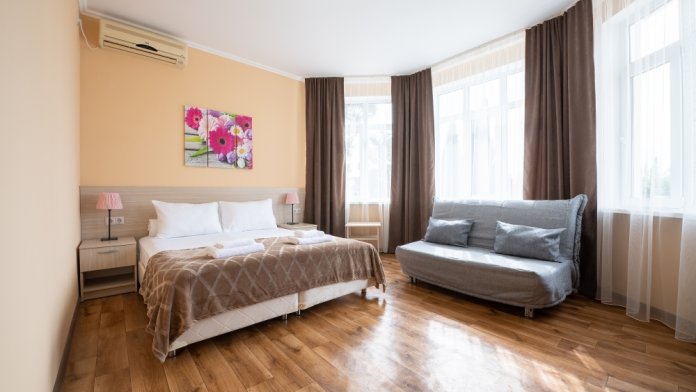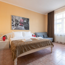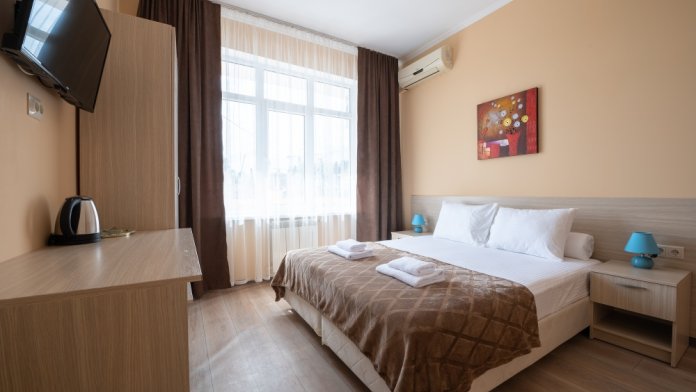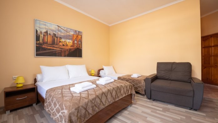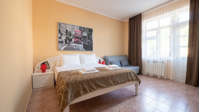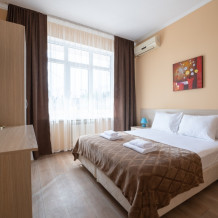 В номере удобная двуспальная кровать и мини-диван или две односпальные кровати с мини-диваном. ЖК телевизор, кондиционер, холодильник и индивидуальный санузел с душем обеспечат ваше удобство. В номере имеется журнальный стол, электрический чайник, шкаф.