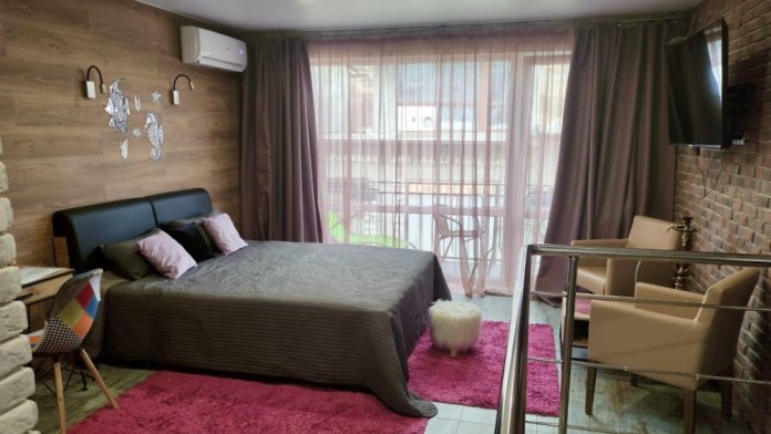 Второй этаж: двуспальная кровать, постельное белье, кондиционер, 2 кресла, столик, телевизор, туалетный столик с зеркалом и стулом, шкаф, прикроватная тумбочка, санузел (душевая кабина, подвесная раковина с зеркалом, унитаз, стиральная машина, полотенца, рукав для сушки полотенец, утюг с гладильной доской, туалетные и ванные принадлежности, бытовая химия, водонагреватель, водоснабжение постоянное (центральное и автономное).