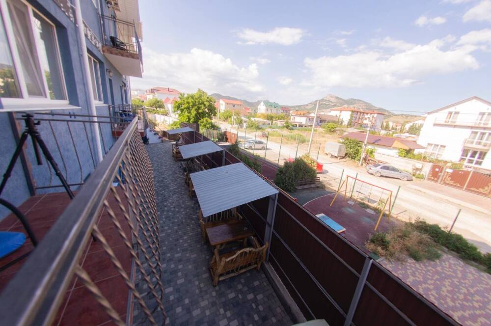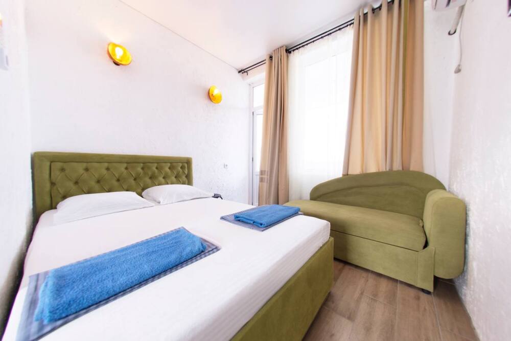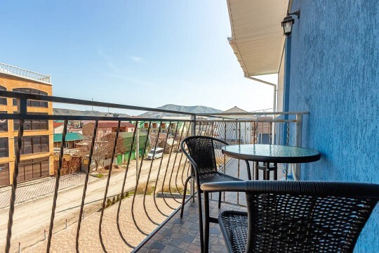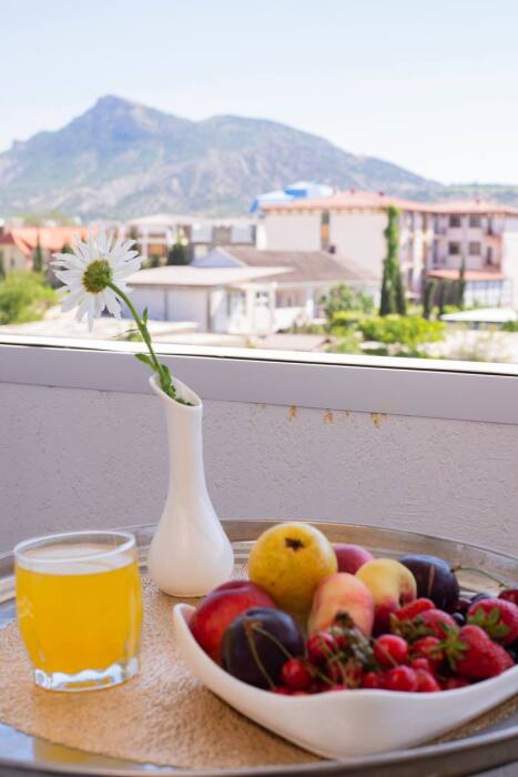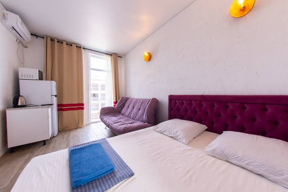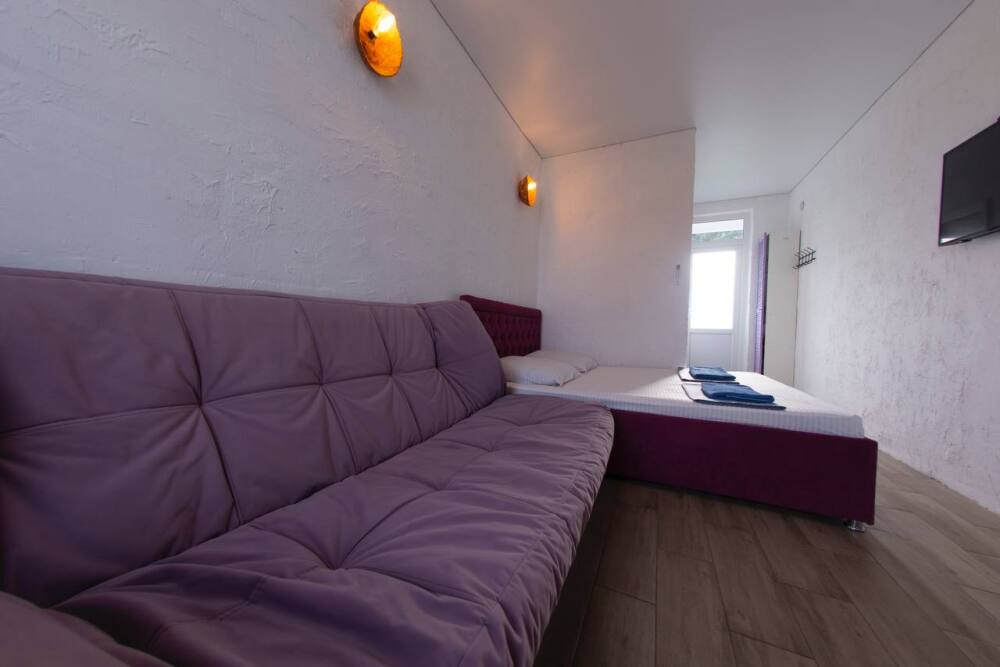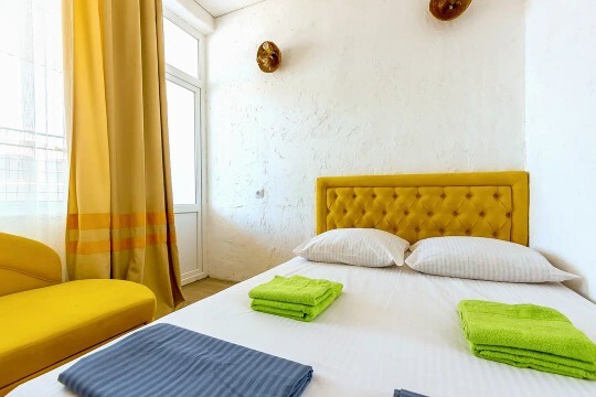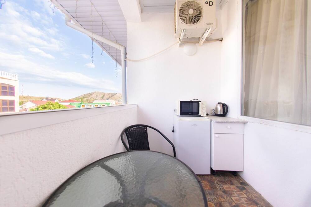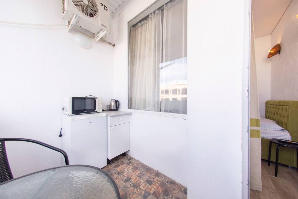 В спальне кондиционер, телевизор, небольшой шкафчик, утюг, на балконе стоит холодильник, микроволновая печь, чайник, тумбочка с кухонной посудой (чашки, тарелки, миски для салатов, миски для фруктов, приборы и доска). Стол и три стула. Номер расположен только на третьем этаже с балконом и красивым видом.
