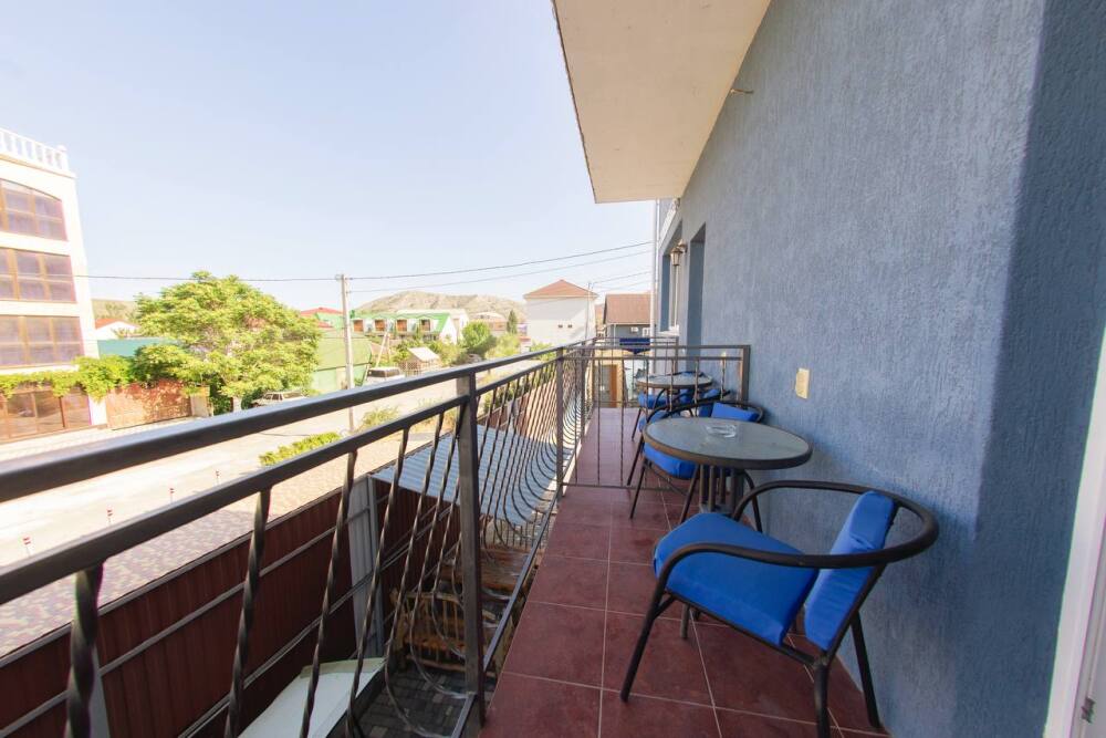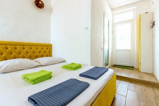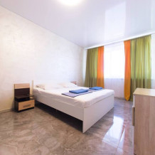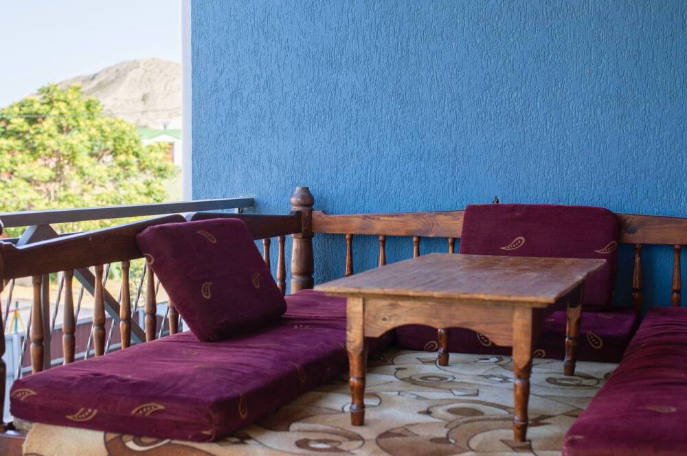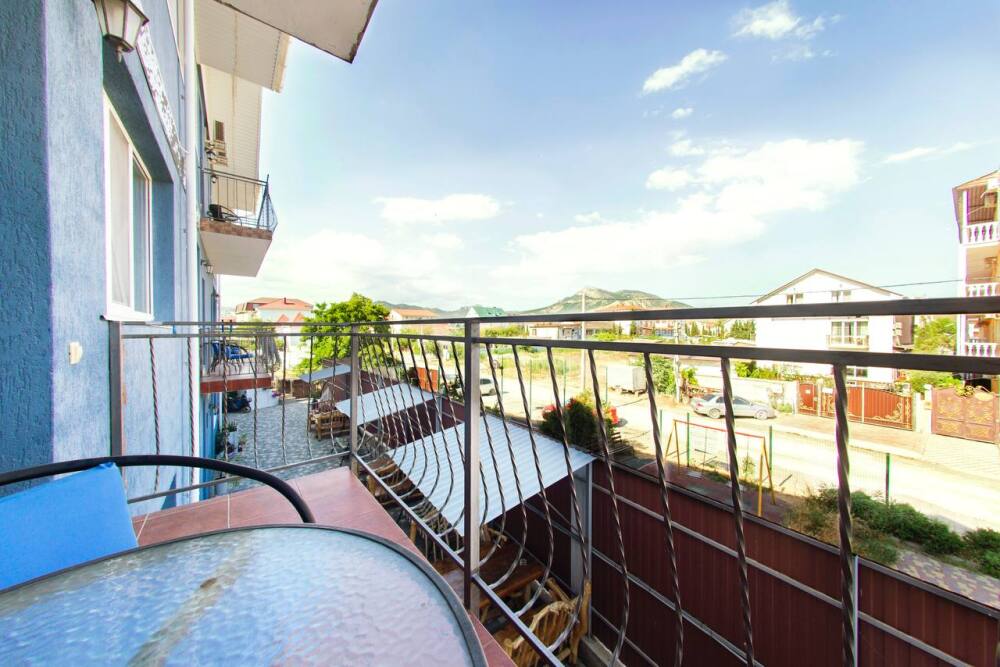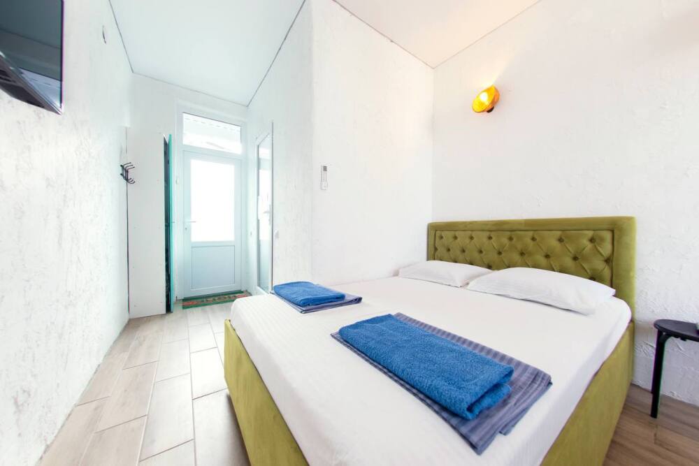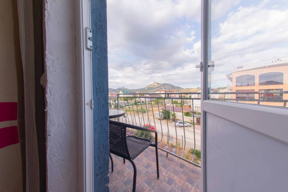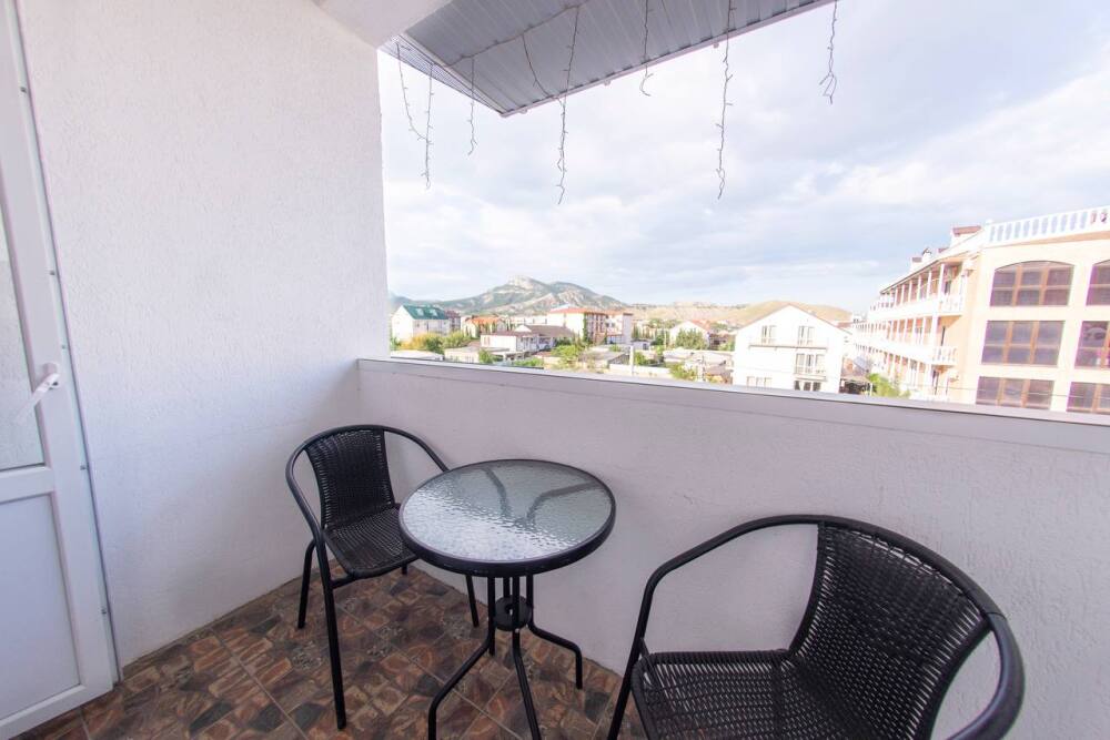 В спальне кондиционер, телевизор, небольшой шкафчик, утюг, на балконе стоит холодильник, микроволновая печь, чайник, тумбочка с кухонной посудой (чашки, тарелки, миски для салатов, миски для фруктов, приборы и доска). Стол и три стула. Номер расположен только на третьем этаже с балконом и красивым видом.