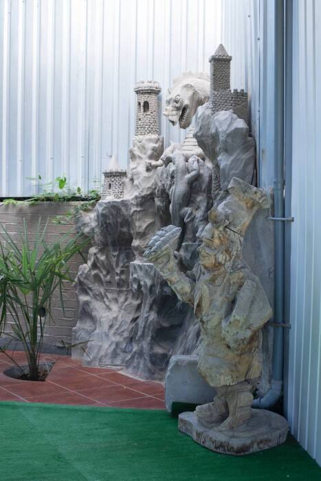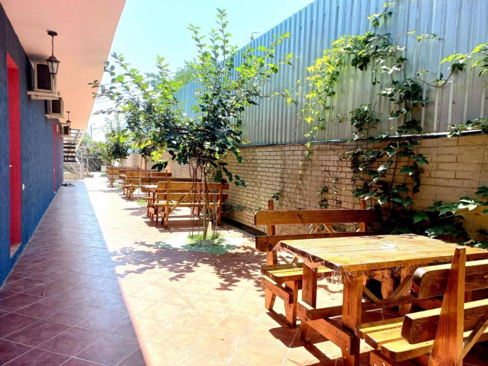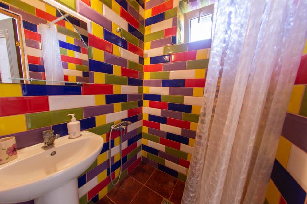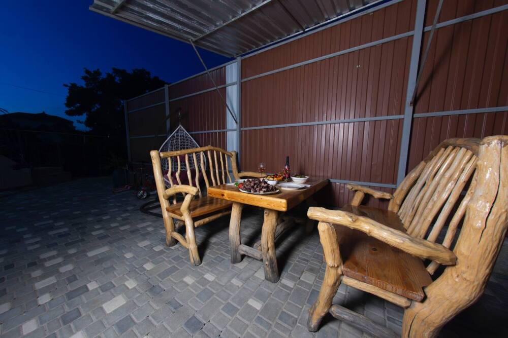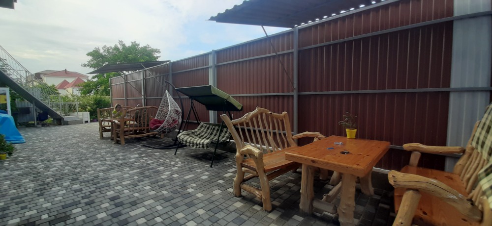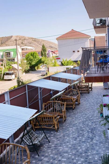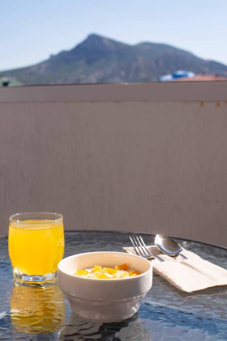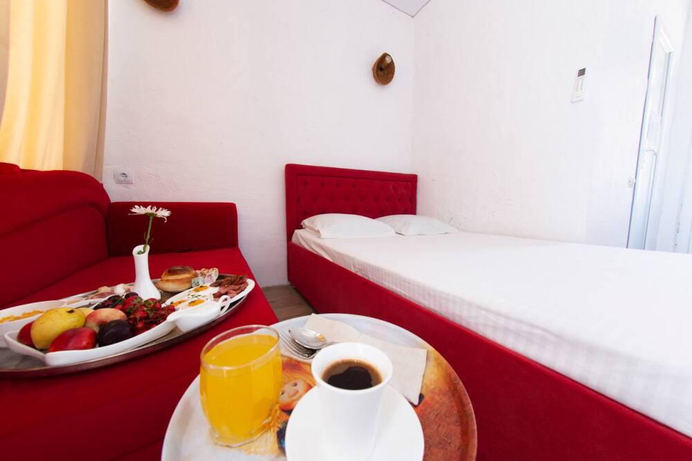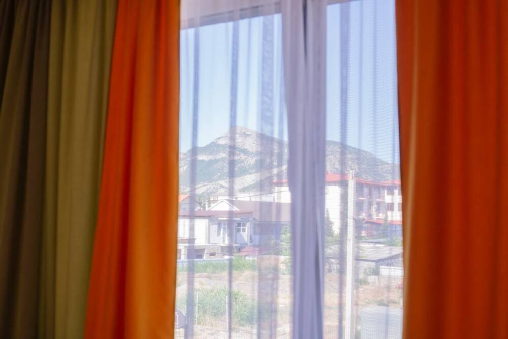 В спальне кондиционер, телевизор, небольшой шкафчик, утюг, на балконе стоит холодильник, микроволновая печь, чайник, тумбочка с кухонной посудой (чашки, тарелки, миски для салатов, миски для фруктов, приборы и доска). Стол и три стула. Номер расположен только на третьем этаже с балконом и красивым видом.