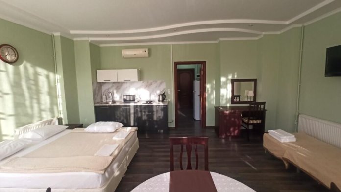 Апартаменты, вместимостью до 4-х человек, расположены на первом этаже с видом на горы и детскую площадку. Две раздельные комнаты, в одной из которых оборудована мини-кухня оснащенная всей необходимой посудой и бытовой техникой. Санузел с душевой кабиной и феном. В комнатах установлены ТВ и кондиционеры. Так же есть утюг и гладильные принадлежности.