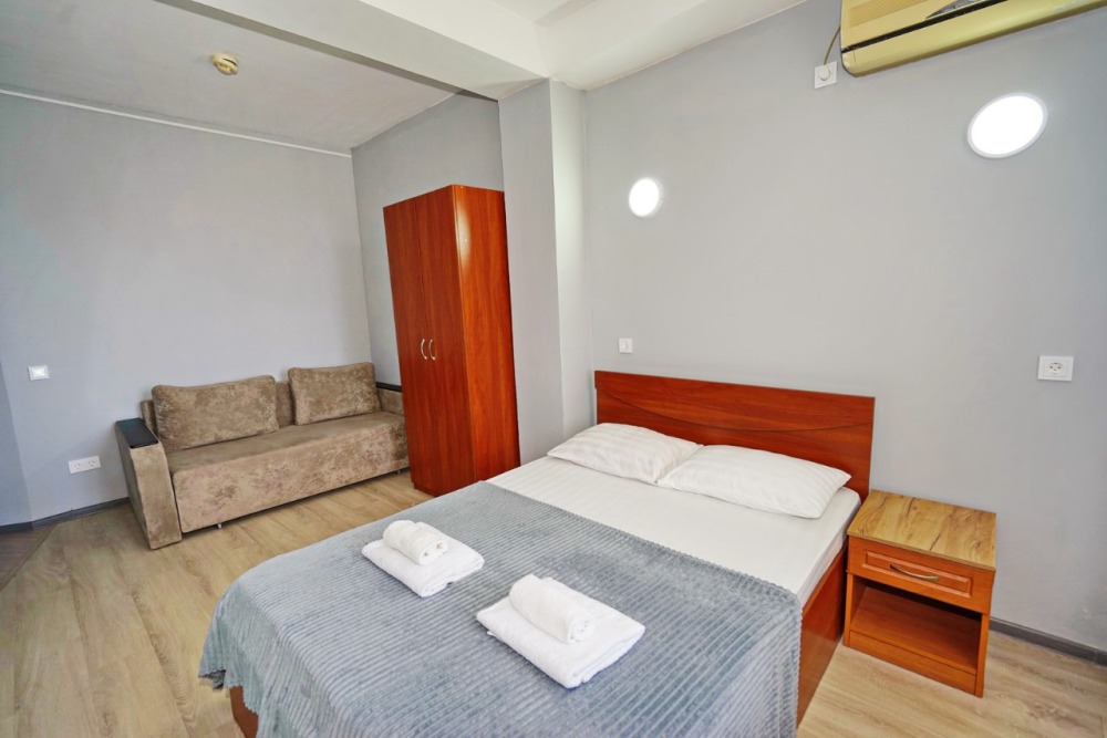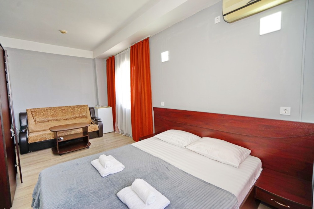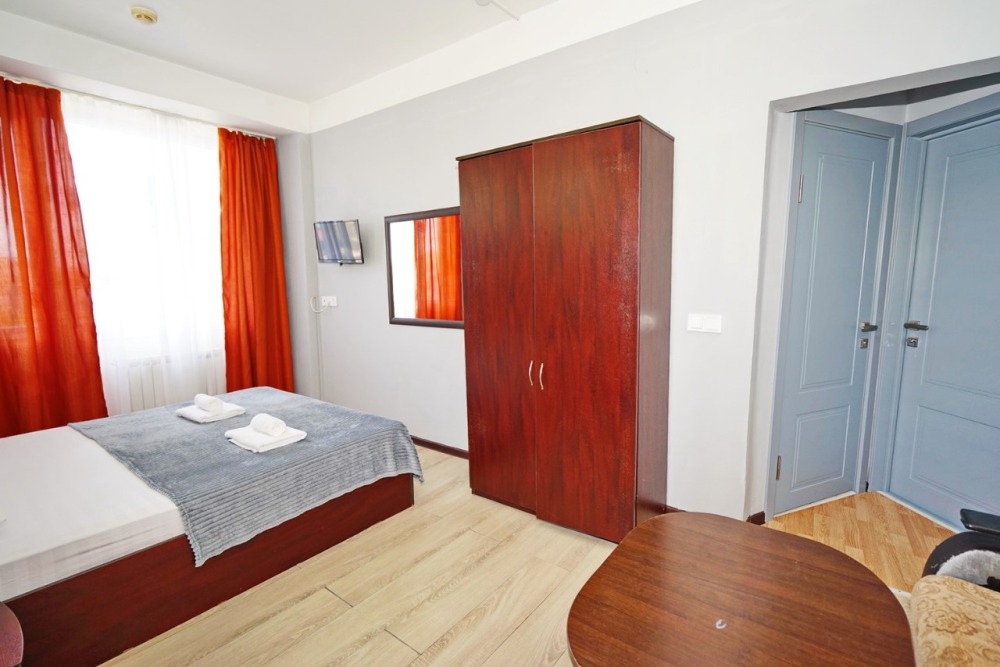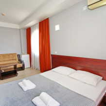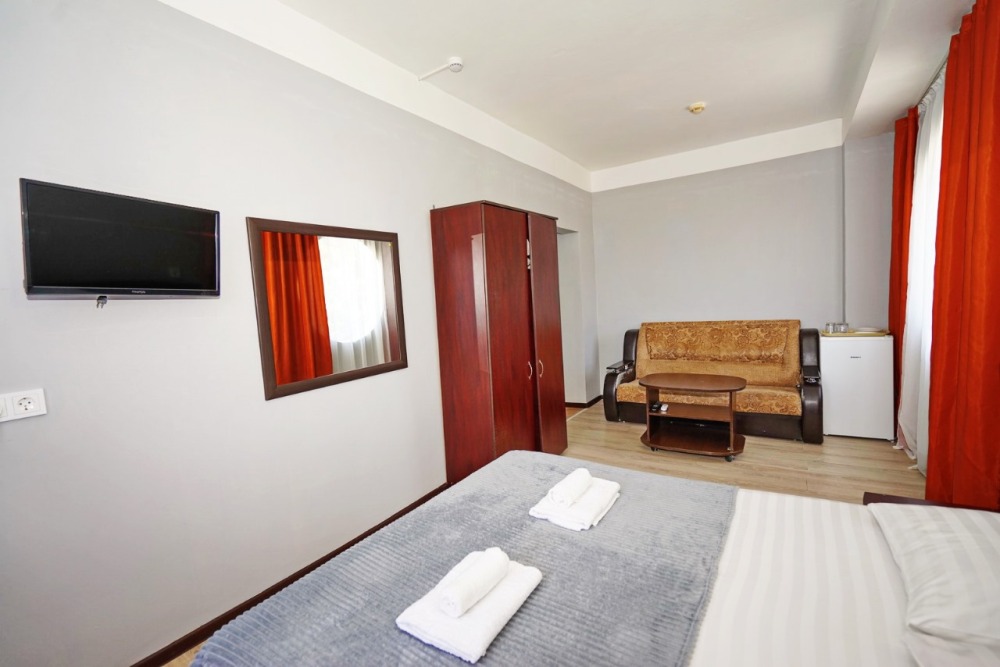 Мебель: двуспальная кровать, дополнительное место (Раскладушка, которая ставится в номер на время сна), прикроватные тумбочки, шкаф, журнальный столик, прихожая.