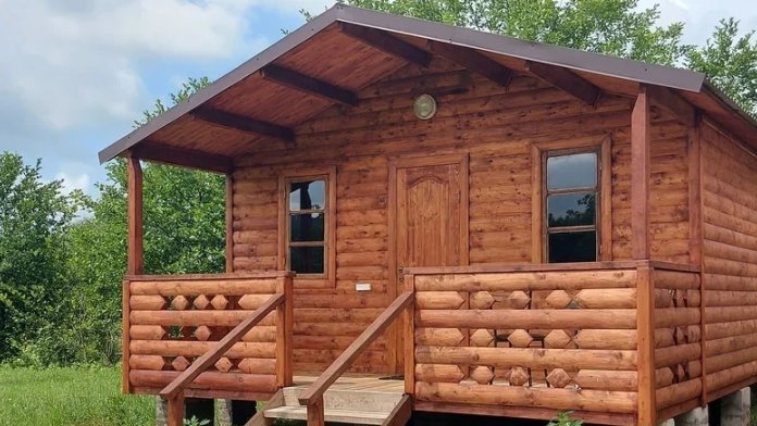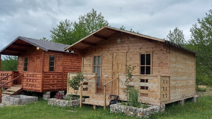 В домиках имеется терраса, 1 двуспальная кровать, раскладной диван, 2 тумбочки, стол и 3 табуретки, вешалка, зеркало.