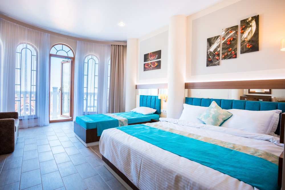 Номер с двуспальной кроватью. Панорамные окна с видом на море и горы. Без балкона.