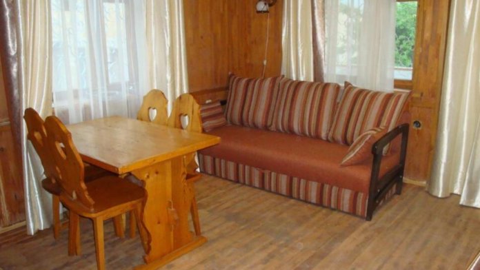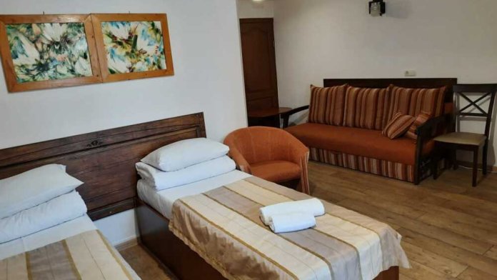 Уютная комната полулюкс семейная с двумя сдвигающимися односпальными кроватями или одной двуспальной кроватью и диван-кроватью 25 кв.м. Для гостей есть все необходимое для комфортного отдыха: балкон, кондиционер, место для хранения вещей, холодильник, кулер с питьевой водой (на этаже), телевизор с плоским экраном, посуда. В собственной ванной комнате: бесплатные туалетно-косметические принадлежности, полотенца, фен, туалетная бумага. В стоимость номера входит пользование бассейном, мангальной зоной, беседками, настольным теннисом, кострищем, залом для спортивных занятий.