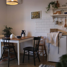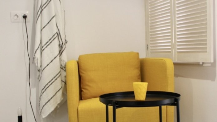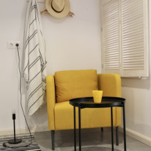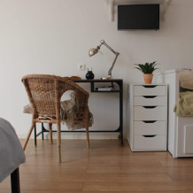 Номер-студия - это самый маленький номер у нас, что не отменяет наличие кухни в нём, а также удобных кресел. Терраса на входе с видом во двор.