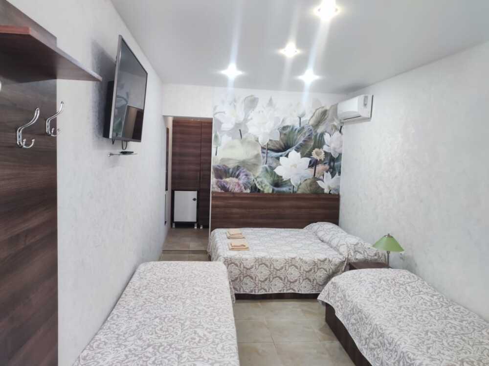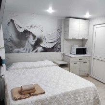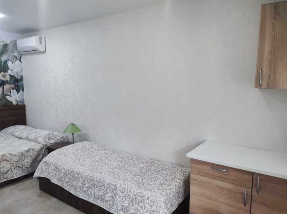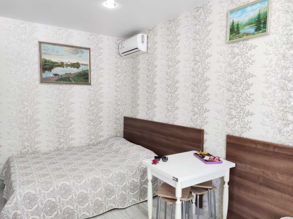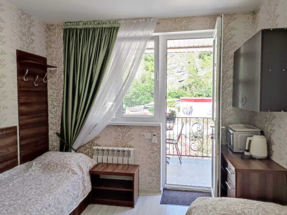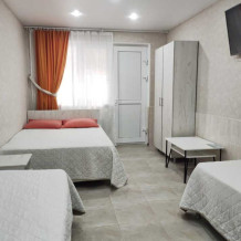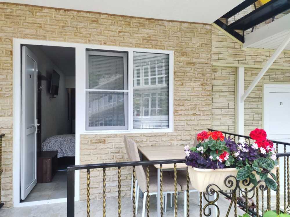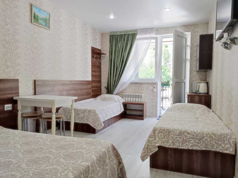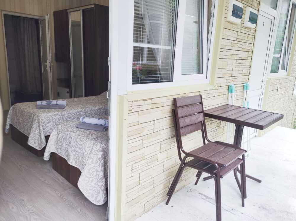 Однокомнатный номер категории стандарт со всеми удобствами, площадью 20 м2 с балконом и без балкона расположены на 2 этаже. В номере 2-х (200*140) спальная кровать, одно-спальная (200*80) кровать, тв, холодильник, сплит-система, чайник электрический, платяной шкаф, сушилка для белья на балконе. Вид из окна на во двор и на горы. Санузел совмещен с душем. На территории гостевого дома работает Wi-Fi. Дополнительное место раскладная кровать.
