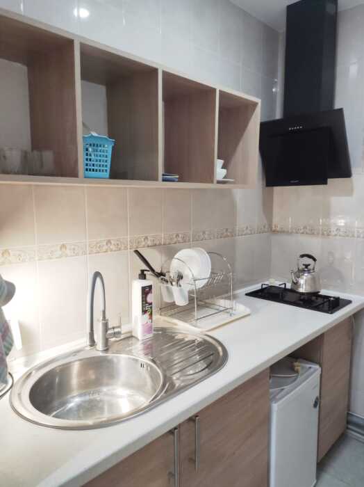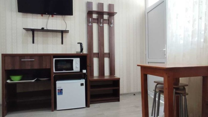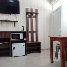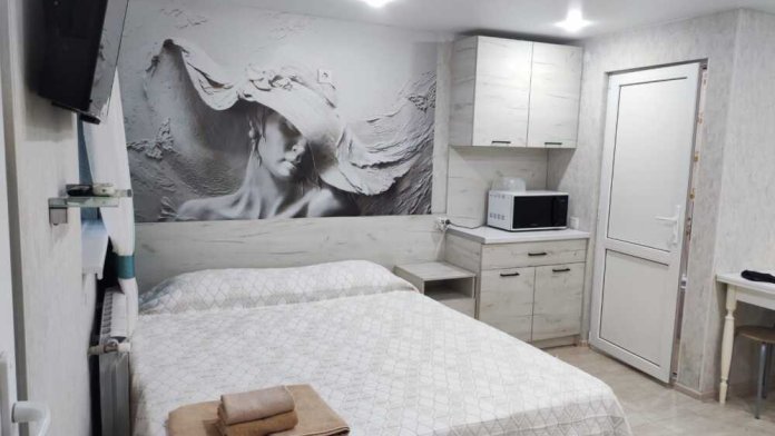 Однокомнатный номер с кухонной зоной, спальных мест 4, площадь 25 кв м, вид из окна на Кавказские горы, во двор. До моря 10 мин пешком. Кухоня оборудована посудой, электрочайником, холодильником, микроволновой печью, варочной плитой, посудой, столовыми приборами, мультиваркой, кухонной мебелью.