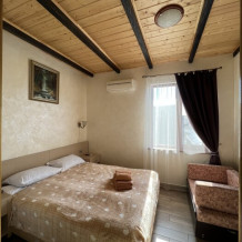 Вы можете арендовать весь домик или выбрать отдельный номер в зависимости от Ваших предпочтений. Всего в доме 4 обустроенных номера с удобствами.