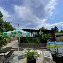 Дом оборудован удобной мягкой мебелью, кухней с сопутствующим инвентарем (посуда, микроволновка, плита, чайник, холодильник), обеденной зоной, телевизором, кондиционером, интернетом, стиральной машиной, изолированным санузлом, в общем, всем необходимым для полноценного отдыха. На придомовой территории расположен бассейн с шезлонгами и зона для отдыха на открытом воздухе с мангалом.