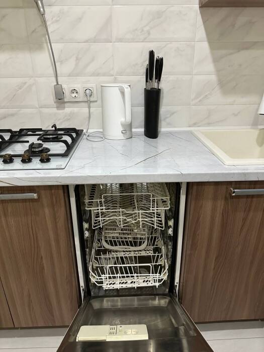 Полное оснащение кухни бытовой техникой, включая микроволновую печь и стиральную машину, позволяет полностью переложить бытовые заботы на технику и сосредоточиться на отпуске. Гладильные принадлежности в прихожей и сушилка за окном — практичные детали, которые делают пребывание здесь максимально автономным и удобным.
