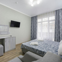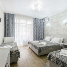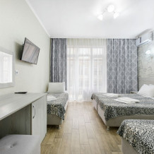 В номере для трех персон имеется: двуспальная кровать, односпальная кровать, или раскладной кресло, кровати можно поставить отдельно, шкаф, вешалка для одежды с обувницей, прикроватные тумбочки, туалетный столик с зеркалом, пуфик. Для Вашего удобства комната оборудована сплит-системой, холодильником, ЖК-телевизором, сейфом. Санузел с душевой кабинкой, туалетом умывальником с зеркалом находится в номере. В этом номере есть возможность установки дополнительного место.