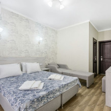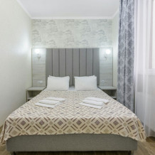 В номере для 4-х персон имеется: двуспальная кровать, раскладной диван, кровати можно поставить отдельно, шкаф, вешалка для одежды с обувницей, прикроватные тумбочки, туалетный столик с зеркалом, пуфик. Для Вашего удобства комната оборудована сплит-системой, холодильником, ЖК-телевизором, сейфом. Санузел с душевой кабинкой, туалетом умывальником с зеркалом находится в номере. В этом номере есть возможность установки дополнительного место.