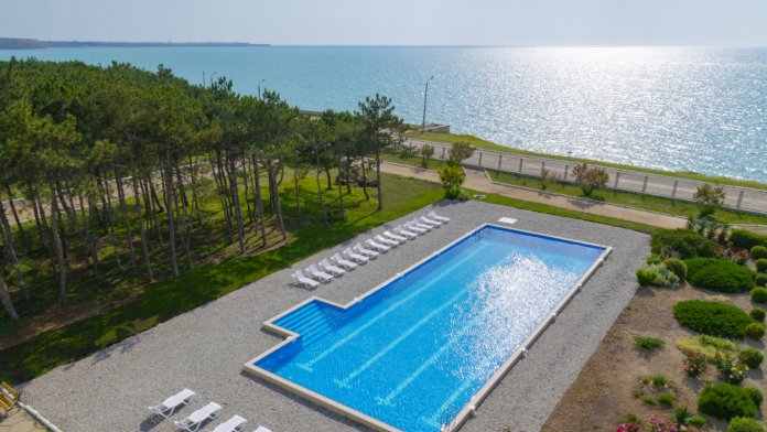 Пансионат «Волна Парк» расположен на первой береговой линии, в 50 м от моря. Между пансионатом и морем нет трасс, дорог, других пансионатов.