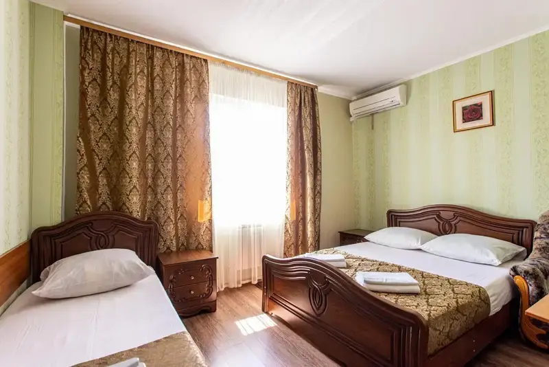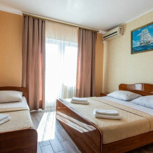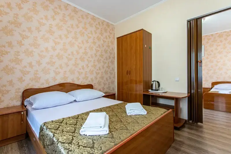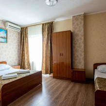Номер меблирован 2-спальной и двумя односпальными кроватями, либо диваном (при размещении доп. места - раздвижным креслом), прикроватными тумбами, стульями, столом и шкафом для размещения гардероба.