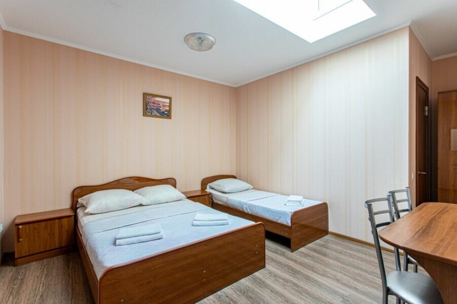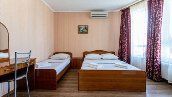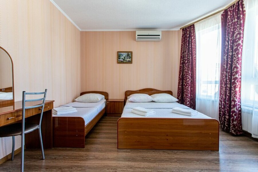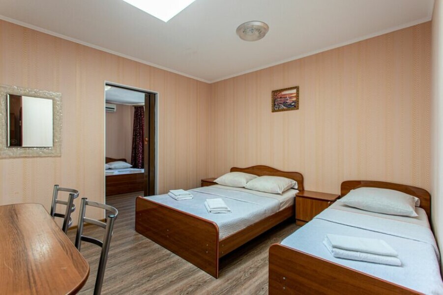 Номер меблирован 2-спальной кроватью, двумя односпальными и кресло-кроватью, прикроватными тумбами, стульями, столом и шкафом для размещения гардероба.